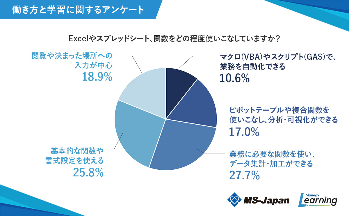 一方で、4.5割の方が基礎的な操作に留まっている点も注目されます。この層の方々が、まずは「VLOOKUP関数」や「ピボットテーブル」といった『脱・基礎レベル』のスキルを身につけるだけでも、業務の質とスピードは大きく向上するでしょう。いきなりマクロやGASはハードルが高いと感じる場合でも、まずは一歩上のスキル習得を目指してみてはいかがでしょうか。