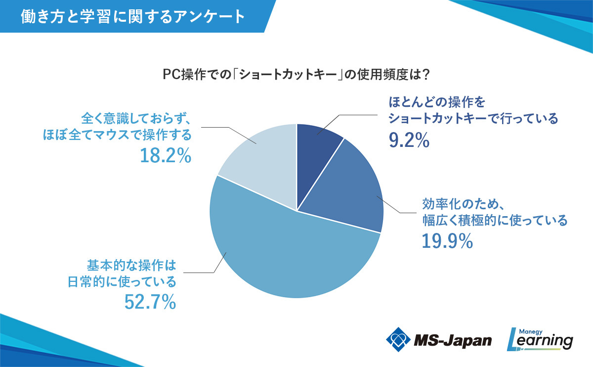 ショートカットキーの使用頻度については、「基本的な操作は日常的に使っている」が52.7%と過半数を占めました。「コピー(Ctrl+C)」「貼り付け(Ctrl+V)」「保存(Ctrl+S)」といった基本中の基本の操作は、多くの方にとって業務に定着していることがわかります。
