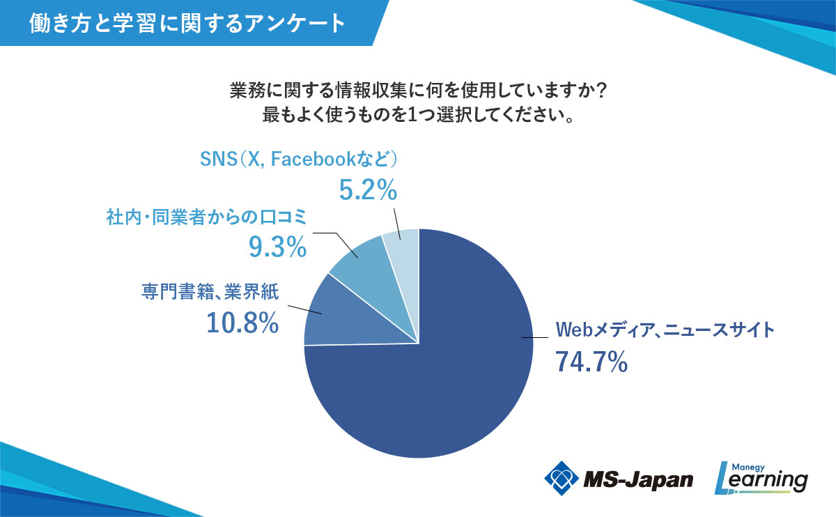 情報収集の手段については、「Webメディア、ニュースサイト」が74.7%と他を大きく引き離す結果となりました。全体の約4分の3が、Web上のメディアをメインの情報源としており、即時性と検索性の高さが実務において不可欠となっていることが推察されます。