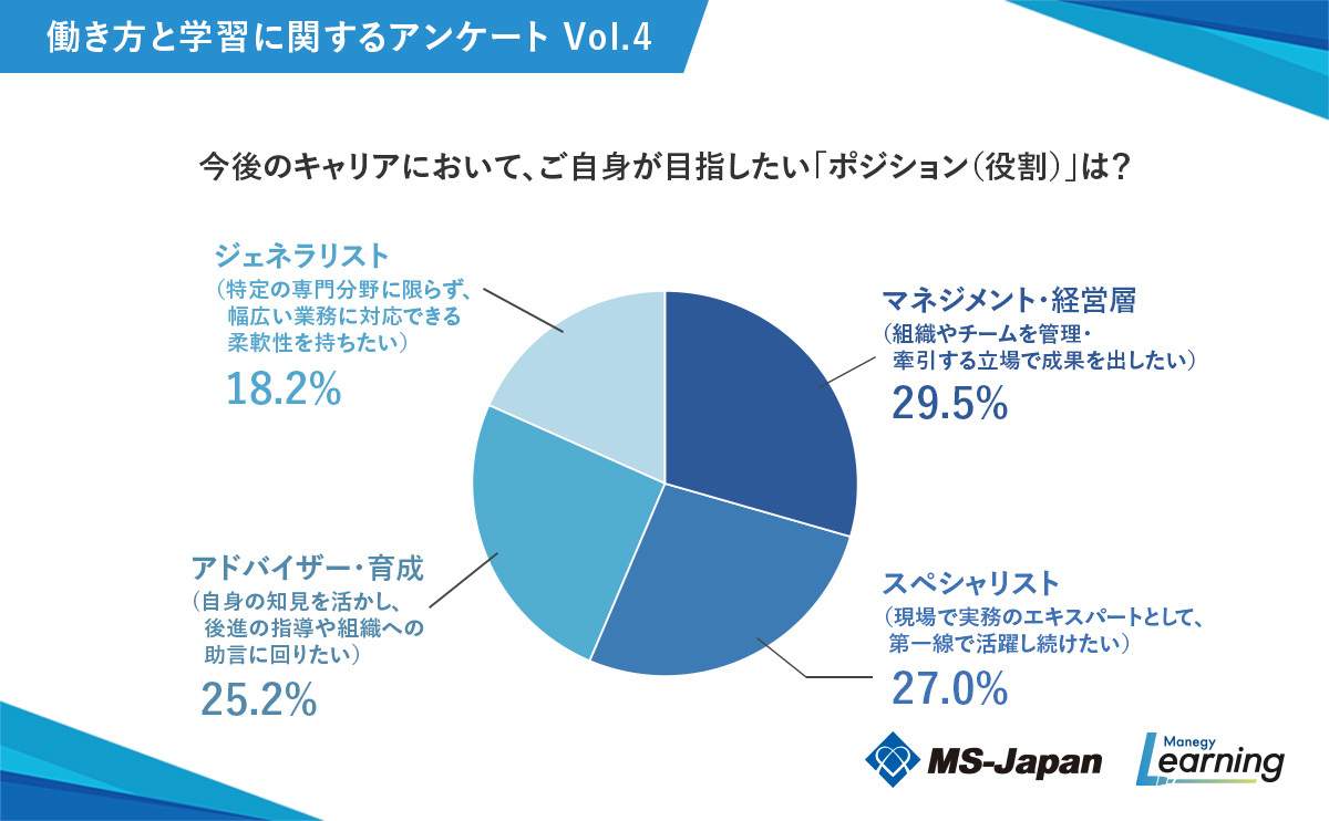 最も多かったのは「マネジメント・経営層(29.5%)」でしたが、次点の「スペシャリスト(27.0%)」とは僅差であり、キャリアの志向性が二極化している様子がうかがえます。