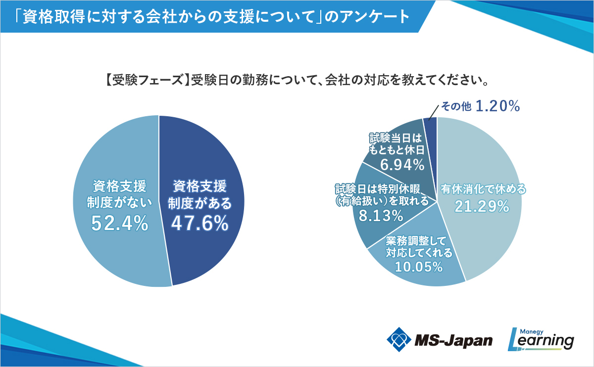 続いて、試験当日の勤務について調査したところ、資格支援制度がないという回答が過半数となりました。