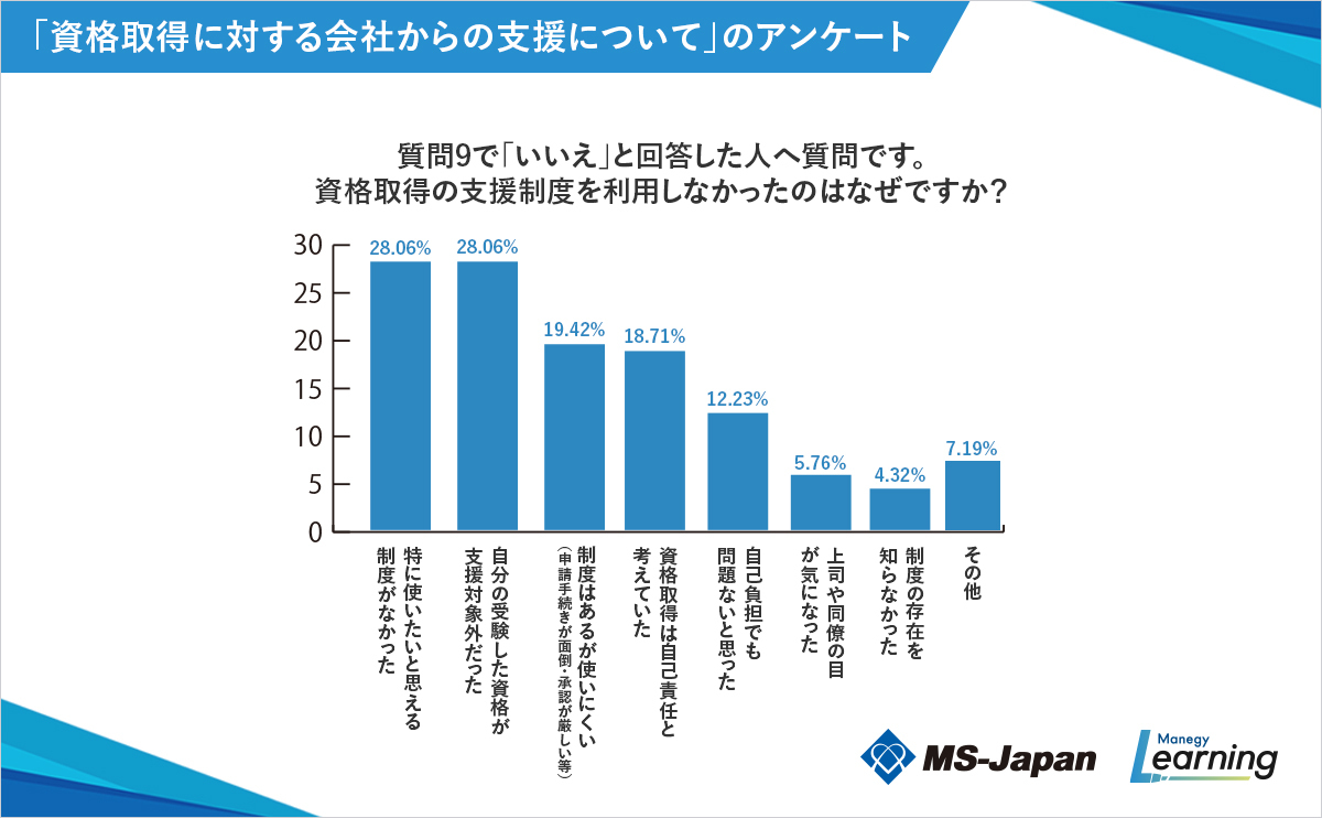 最も多かったのは「特に使いたいと思える制度がなかった」「自分の受験した資格が支援対象外だった」という回答で、それぞれ30%弱がこの回答を選択しています。次いで、「制度はあるが使いにくい(申請手続きが面倒・承認が厳しい等)」「資格取得は自己責任と考えていた」と続きます。