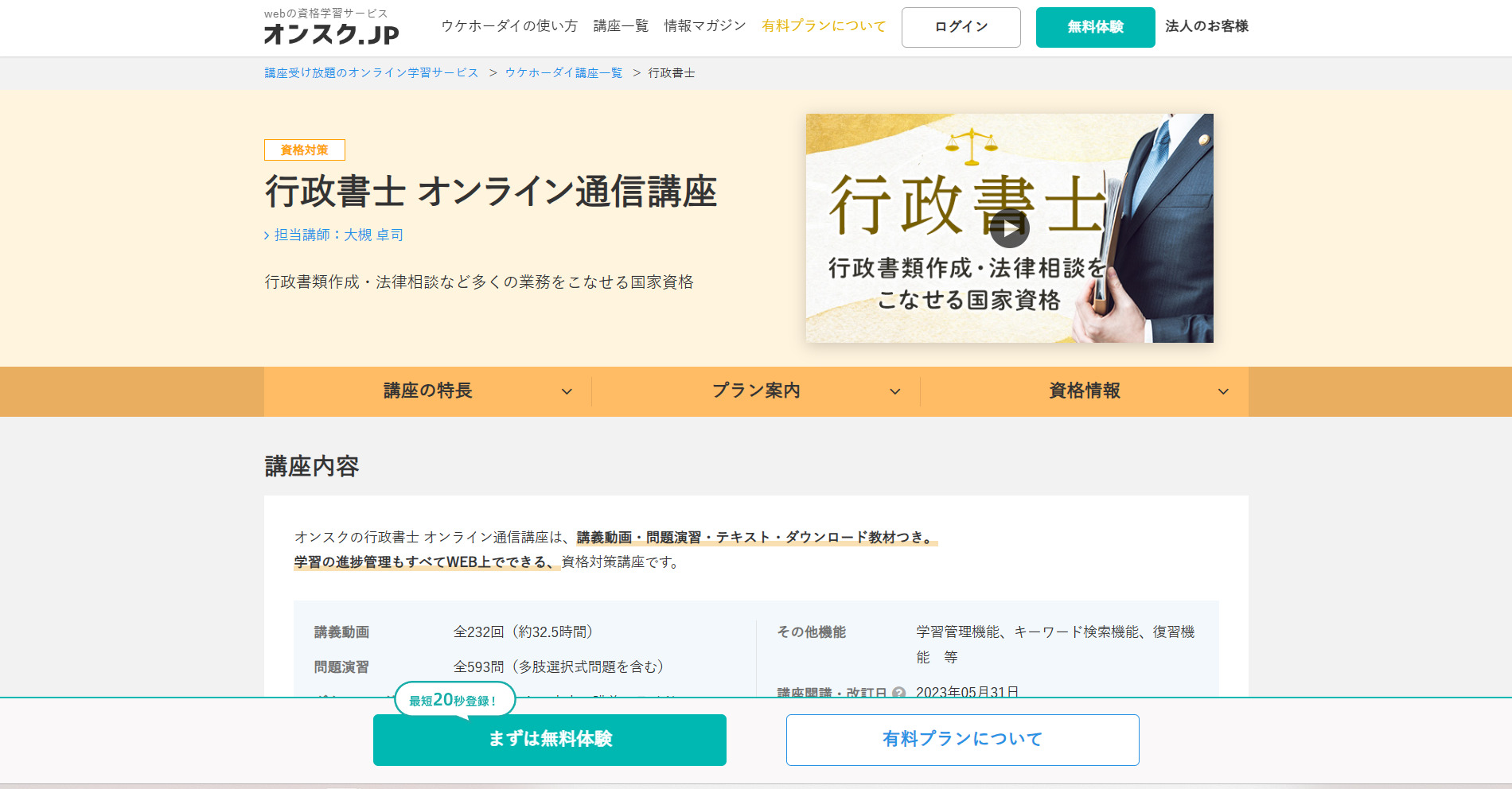 オンスク.JPは様々な資格講座の講義動画が月額定額で見放題になるオンライン学習サービスで、行政書士講座もこの定額プラン内で受講可能です。