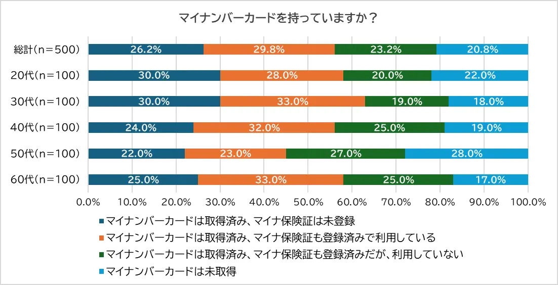 まず、「マイナンバーカードを持っているか?」聞いたところ、「取得済みでマイナ保険証も利用している」(29.8%)、「取得済みでマイナ保険証は未登録」(26.2%)、「取得済みでマイナ保険証も登録済みだが利用していない」(23.2%)、「未取得」(20.8%)となりました。