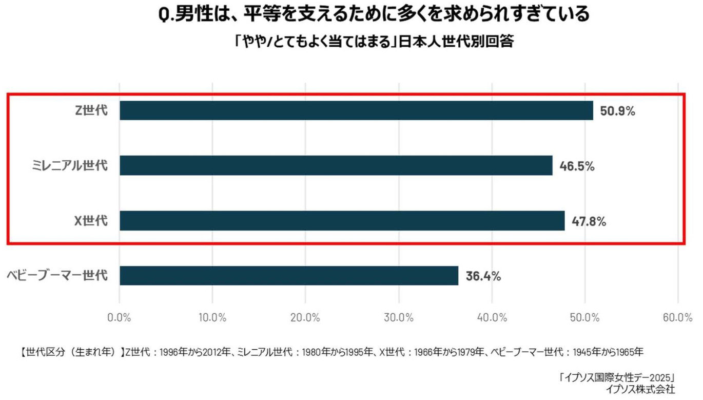 イプソスの調査によると、「男性は、平等を支えるために多くを求められすぎている」に「やや/とてもよく当てはまる」と回答した日本人は45%で、2019年からの6年間で10ポイント増加した。特に男性の同意率が高く、男性53%、女性38%と約1.4倍の差があった。世代別では、ベビーブーマー世代以外(60歳未満の男女)が同様に感じていた。