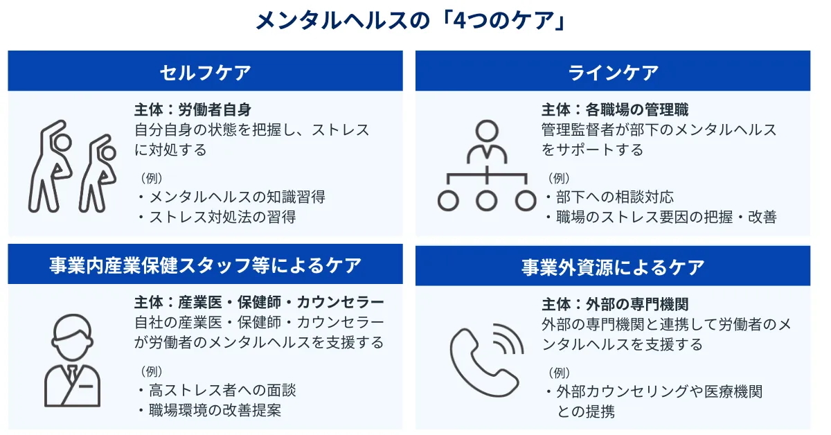 企業はこの4つのケアを継続的かつ計画的に実施し、従業員が心身ともに健康に働ける環境を整備することが求められます。