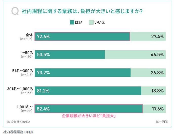 また、規程業務の負担が大きいと回答した担当者は全体で72.6%に対して、大企業が82.4%と高く、企業規模が大きいほど「負担が大きい」と感じる傾向にあることが示された。