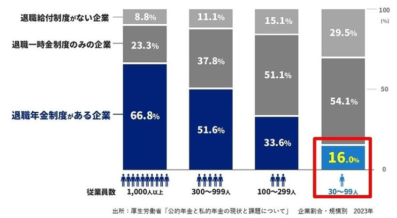 日本の企業数の99%以上が中小企業だが、従業員規模が小さいほど、退職年金制度の実施割合は低いのが実状だ。従業員規模30~99人の企業では導入率は16%にとどまる一方、従業員数1000人以上の企業では7割近くに達する。