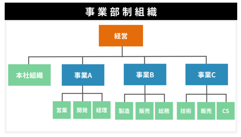 本社の下に各事業を運営する事業部を置き、それぞれが事業を経営する組織形態である「事業部制組織」。一定以上の規模感がある組織を効果的に事業運営するために用いられる組織形態です。
