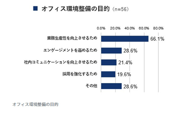 また、オフィス環境整備の目的について質問したところ、66.1%が「業務生産性を向上させるため」、次いで28.6%が「エンゲージメントを高めるため」と回答。他にも、「社内コミュニケーションを向上させるため(21.4%)」、「採用を強化するため(19.6%)」という回答があった。