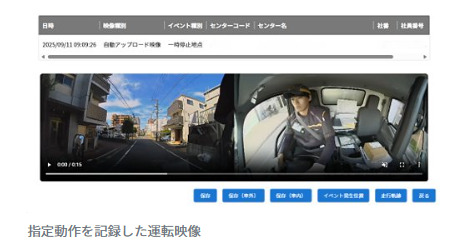 新しいドライブレコーダーは、急アクセルや急ブレーキなどの動作を検知すると、ドライバーに音声で注意喚起。同時に運転映像が自動でクラウドにアップロードされ、運転日報に記録される。急アクセルなど指定動作の回数による定量的な指導に加えて、保存された運転映像を用いて一人ひとりに合わせた指導が可能になるため、ドライバーの納得感の向上にもつながるとしている。