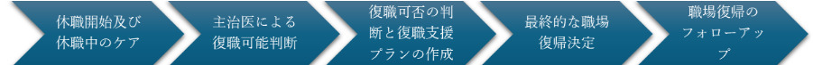 休職開始から職場復帰までの主なステップとしては下記の5ステップになります。なお、ここではメンタル不調による休職を前提とした職場復帰までのステップを解説します。
