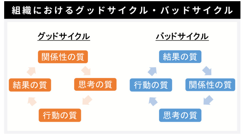 グッドサイクルは成功している組織、バッドサイクルは成功していない組織です。それぞれサイクルは、どちらも4つの要素(関係性の質・思考の質・行動の質・結果の質)から成り立っており、この4つの要素をどう繋げていくかが「成功循環モデル」のポイントになっています。