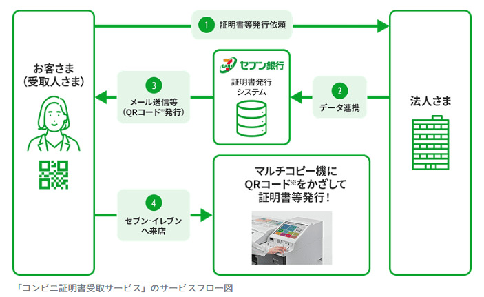 「コンビニ証明書受取サービス」は、企業や団体が発行する各種証明書類を、セブン‐イレブン店舗のマルチコピー機を使って従業員などの個人が受け取ることができる仕組み。セブン銀行が提供するシステムを利用し、2024年2月にサービスを開始した。