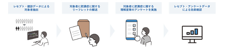 両社は、健康保険組合から提供されるレセプトデータおよび健康診断データを基に、BMI25以上かつ健康障害を有しながら治療を受けていない人を抽出する。該当者には、肥満症に関する理解を促し、医師への相談を勧めるリーフレットなどを郵送する。