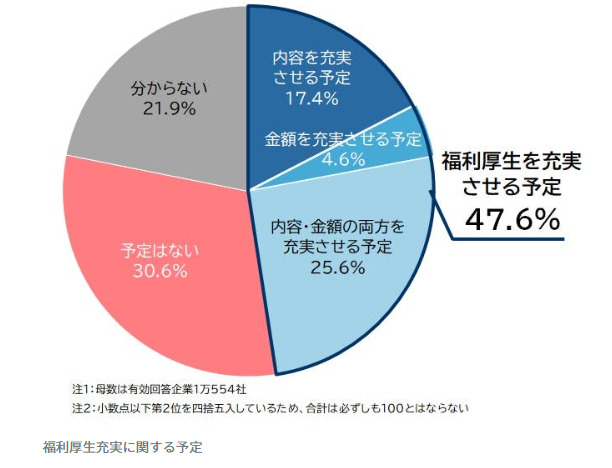 帝国データバンク(東京都港区)は10月23日、全国2万5546社を対象に実施した「福利厚生に関する企業の実態調査」の結果を発表した。47.6%の企業が福利厚生を充実させる予定と回答し、全体の約半数に達したことが明らかになった。