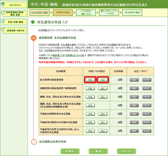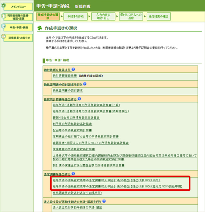 3) 「給与所得の源泉徴収票等の法定調書【提出枚数 100枚以内】」又は「給与所得の源泉徴収票等の法定調書【提出枚数 100枚超対応/CSV読込専用】」を選択します。