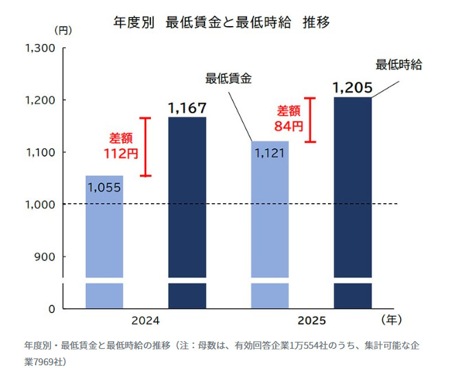 帝国データバンク(東京都港区)は10月24日、全国2万5546社を対象に実施した最低賃金に関するアンケート調査において、最低時給の全体平均(正社員・非正規社員を含む)は1205円で、厚生労働省が公表した2025年度の最低賃金の全国加重平均(1121円)を84円上回ったと発表した。