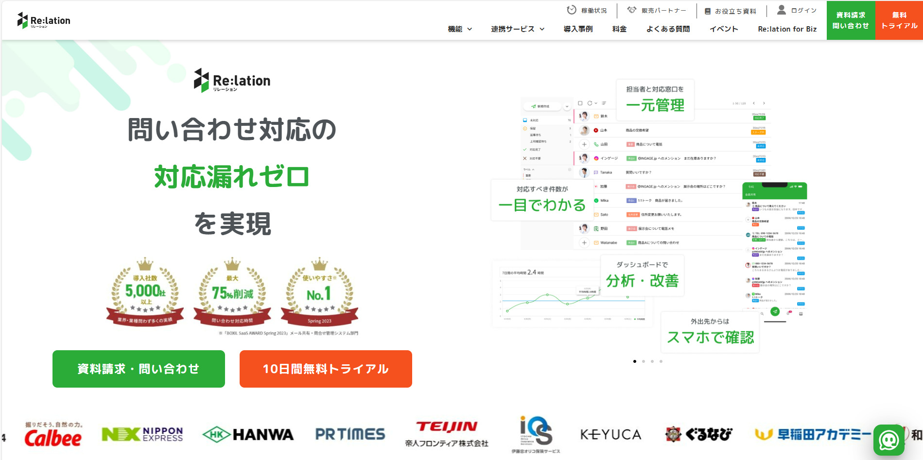 『Re:lation(リレーション)』とは、企業が行う問い合わせ対応業務において、対応漏れ・ミスを「ゼロ」にし、応対品質の向上・効率化することのできるクラウドサービスです。