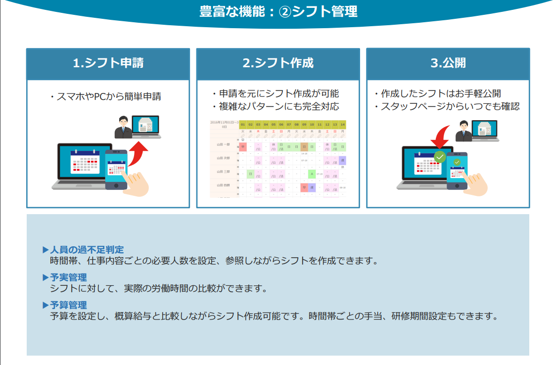 スマートフォンを利用したシフトの申請や確認もできるので、従業員にシフト確認する手間も削減できます。