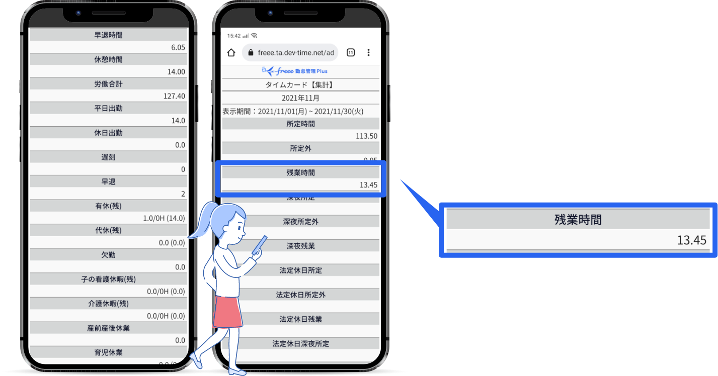 馴染みのあるタイムカードと同じ見た目であり、従業員は迷わず自分自身の残業時間や有休の取得日数を確認できます。これにより、労務・総務への問合せを減らすことができます。