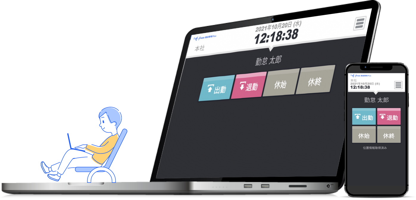 いつでも、どこでも簡単にスマホやフィーチャーフォンから打刻することができます。 また、位置情報を取得できるため、直行直帰やテレワークにも最適です。