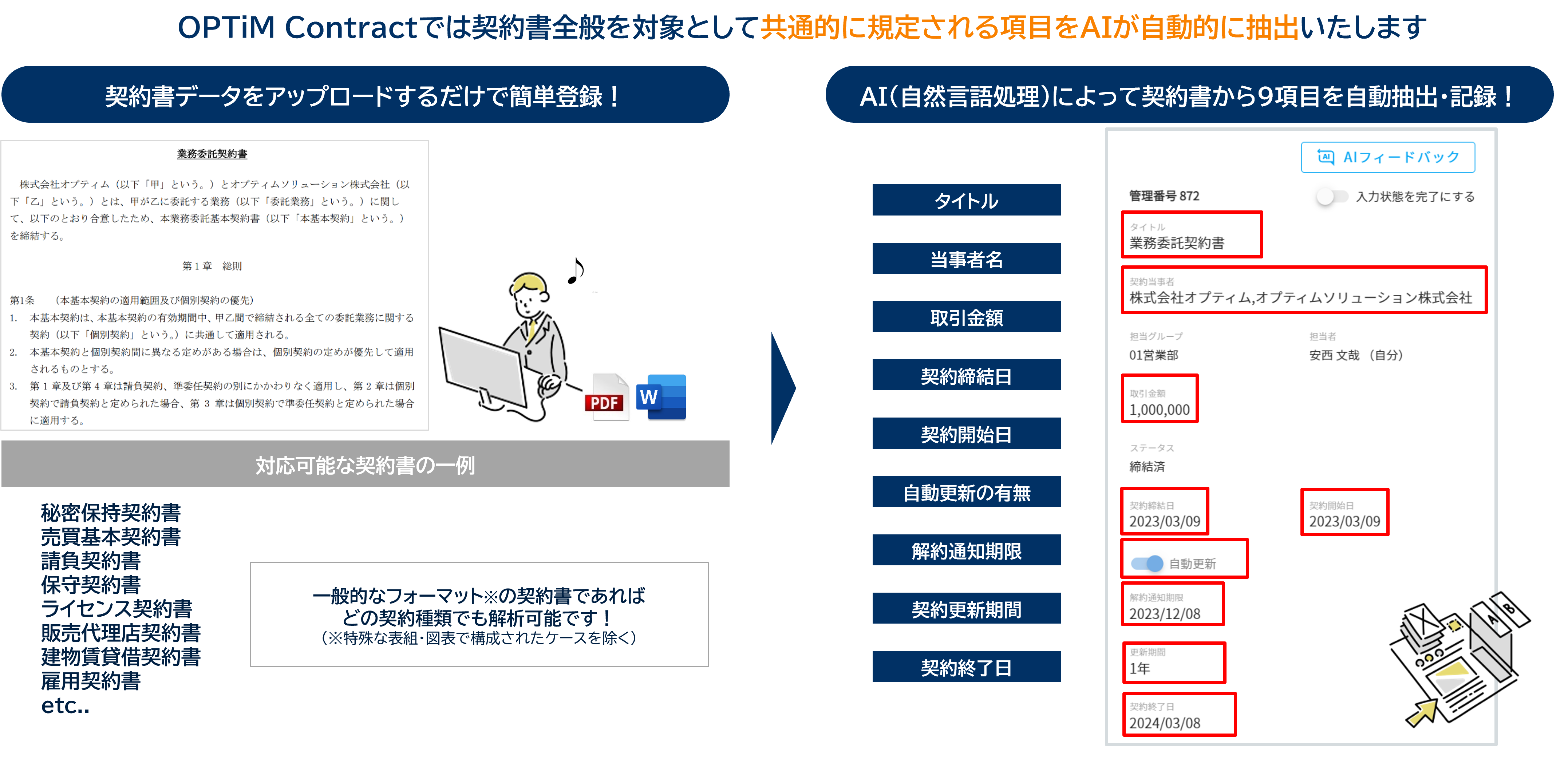 契約書種別・契約相手・有効期間などの管理に欠かせない情報を自動取得!