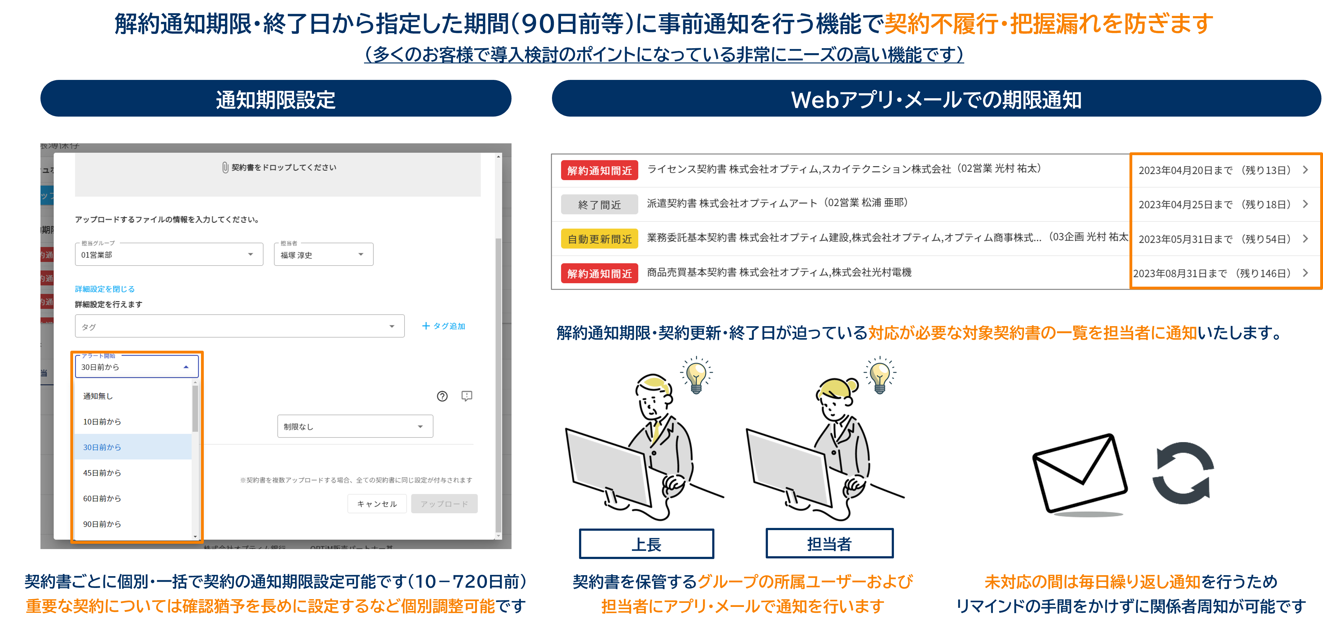 契約の終了前に担当者と部署の管理者へお知らせメールを見るだけで漏れなく期限確認が可能です。