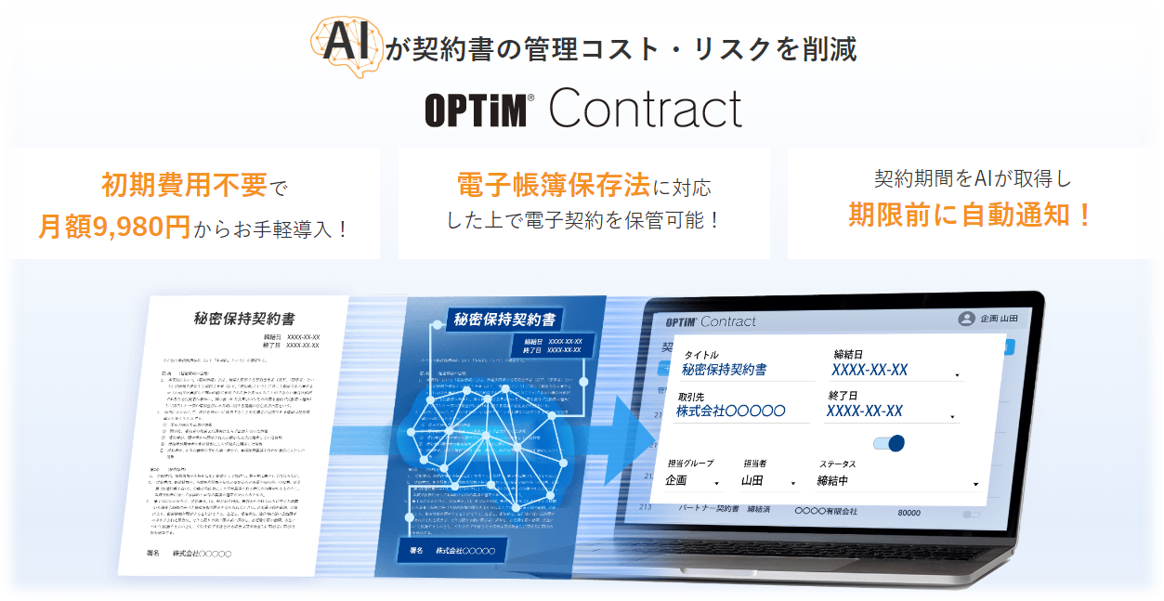 OPTiM Contractとは 企業の契約書管理において総務・法務担当者を悩ます以下の課題はございませんか? ・管理台帳に契約書情報の入力や情報の仕分けに工数がかかってしまっている ・部署や担当者ごとに閲覧権限設定に課題部署異動・担当変更に工数がかかってしまっている ・紙・電子を一元管理、電子帳簿保存法にも対応したい有効期限が近付いたら担当者に通知をしたい OPTiM Contractなら契約書管理の課題を一手に解決いたします!