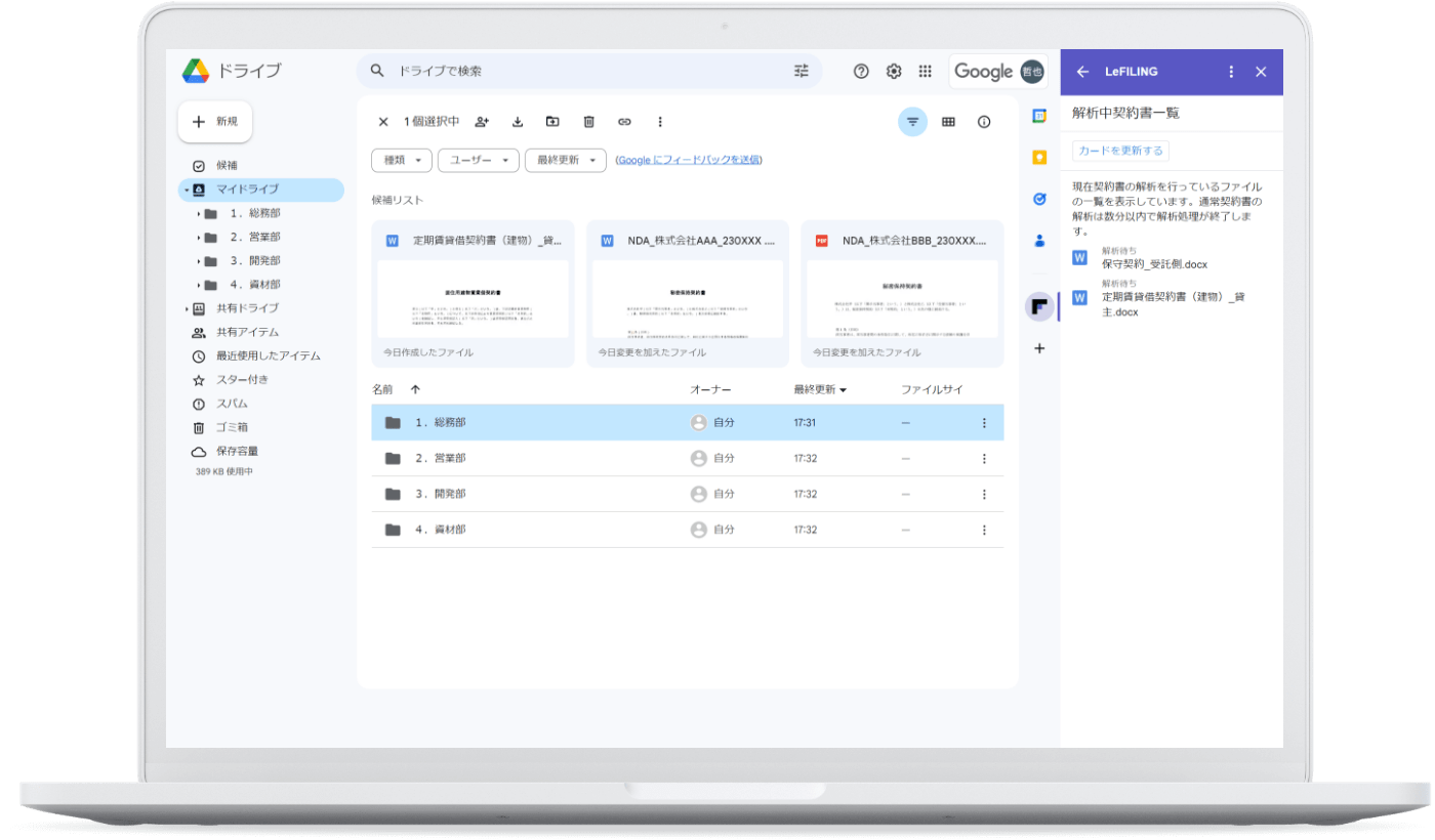 LeFILING(リファイリング)は、GoogleDriveにアドオンするだけで契約書管理の悩みを解決するサービスです。GoogleDriveに保存した契約書をAIが自動解析し、読み取った内容を 自動でラベル付けすることで、契約書管理が簡便になります。