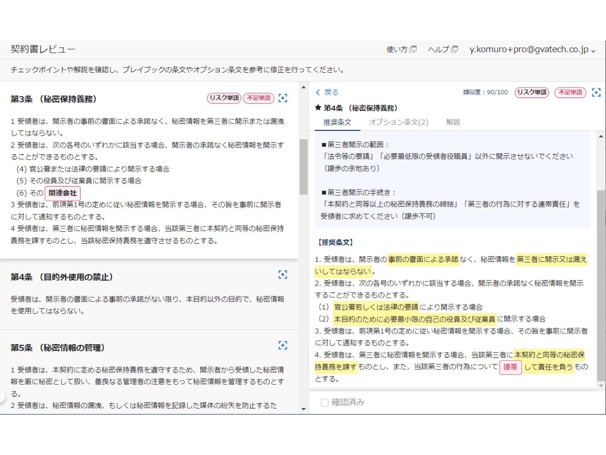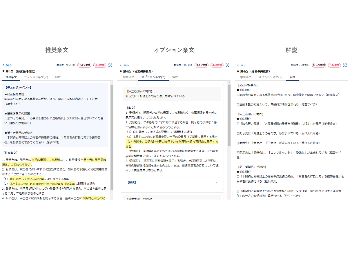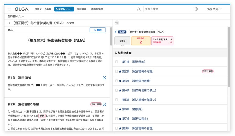 契約書ひな型に対する不足条文や、契約書内のリスクワードを瞬時に検知。