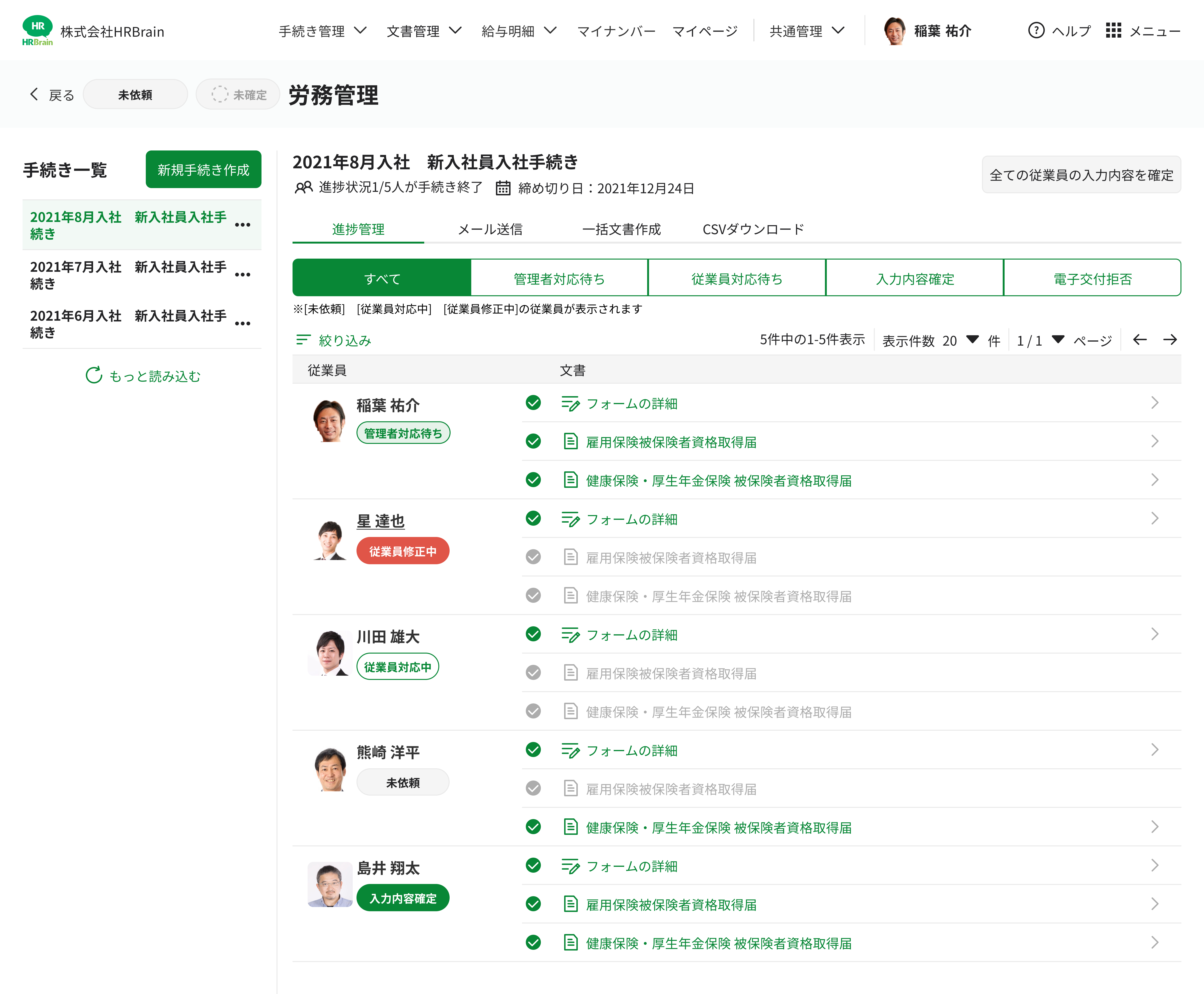「HRBrain労務管理」は、入退社手続きや年末調整で発生する人事労務業務をペーパーレス化することで、労務業務につきまとうリスクとコスト削減ができる労務管理システムです。