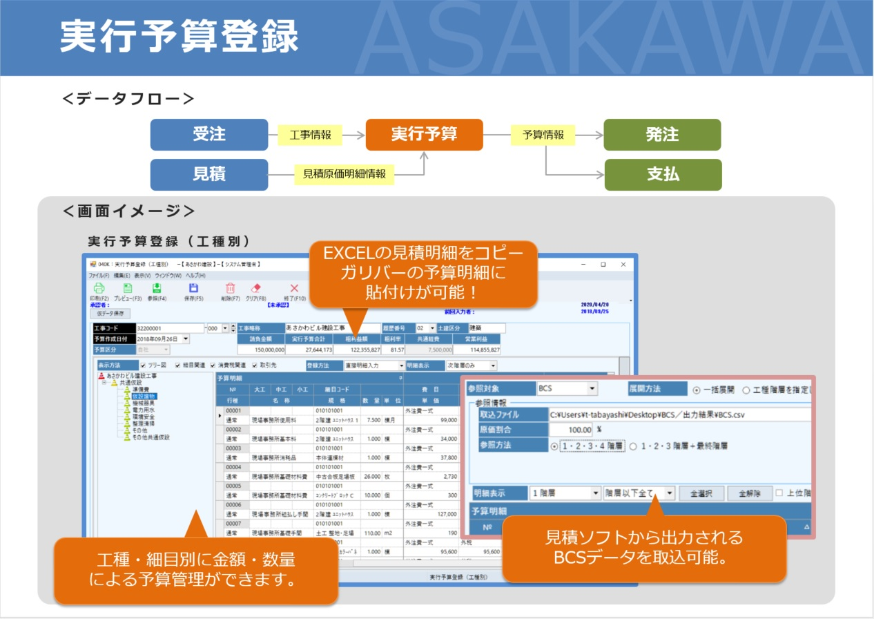 『ガリバーシリーズ』は、中堅ゼネコンで実際に利用しているシステムをパッケージ化としており、建設工事業の業務フローに沿って案件の発⽣から⼯事完成までに⽣じる業務を一元管理し、業務効率化を手助けする統合型工事ソリューションです。