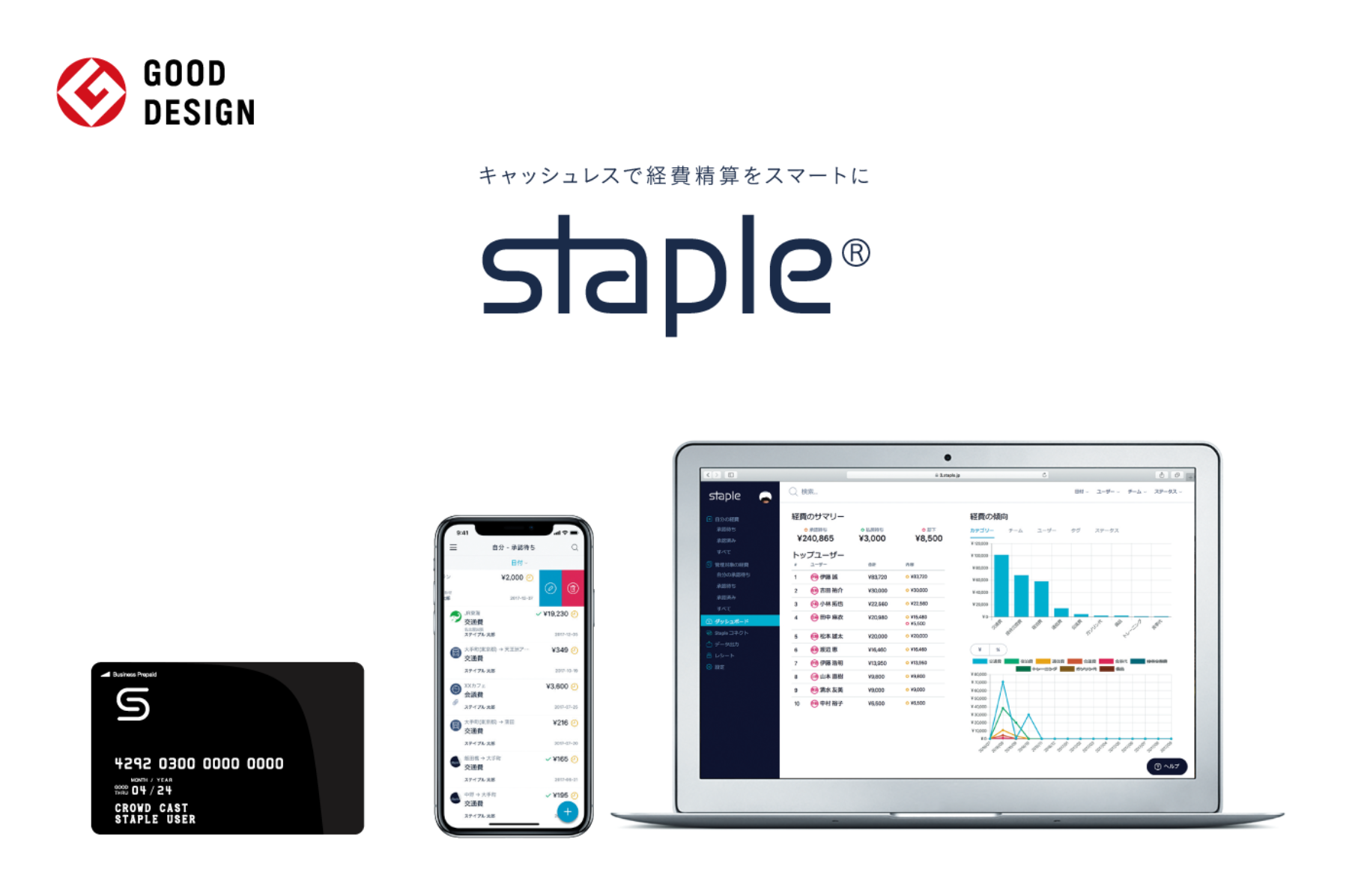 また、Stapleと一体型の、国内初、経費精算サービス一体型法人プリペイドカード「Staple カード」、交通費や会議費、交際費、出張時のチケット購入や宿泊費等だけでなく、インターネットでのお支払いなど、国内外のVisa加盟店で利用いただけます。