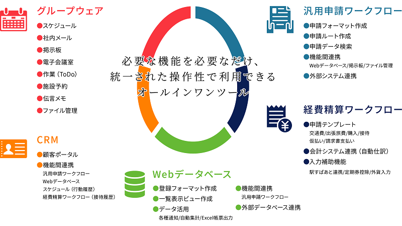 POWER EGG(パワーエッグ)は、グループウェアやWebデータベース、汎用申請ワークフロー、経費精算ワークフロー、 CRMの5つの機能を備えた、オールインワン型の情報活用ツールです。