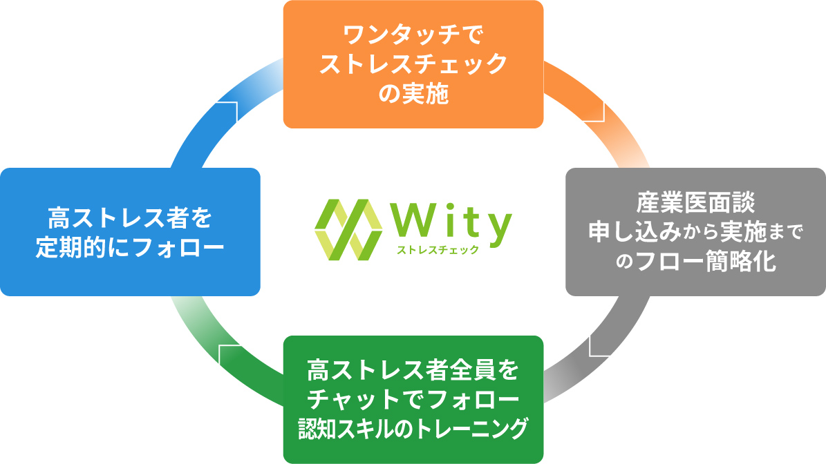 Wity(ウィティ)は、ワンストップでストレスチェック実施から社員の継続的なフォローまで行うツールです。