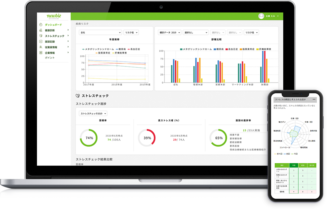 アフターコロナ対策も「newbie(ニュービー)」で!シンプルな操作性と直感的なデザイン。メニュー単位の利用でリーズナブルに。「newbie」は、健康診断結果のデータ化・分析からストレスチェックの実施・報告など、健康管理業務に係る情報を丸ごと一元管理できるクラウド型健康情報管理システムです。社員の健康情報を集約・管理することで、健康管理業務の支援・効率化と、企業の健康課題の把握・分析による生産性向上を実現します。
