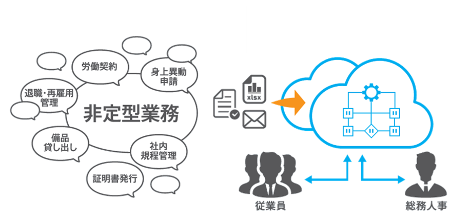 紙やExcel、メール等で行われている様々な総務人事業務をクラウド化することで、
