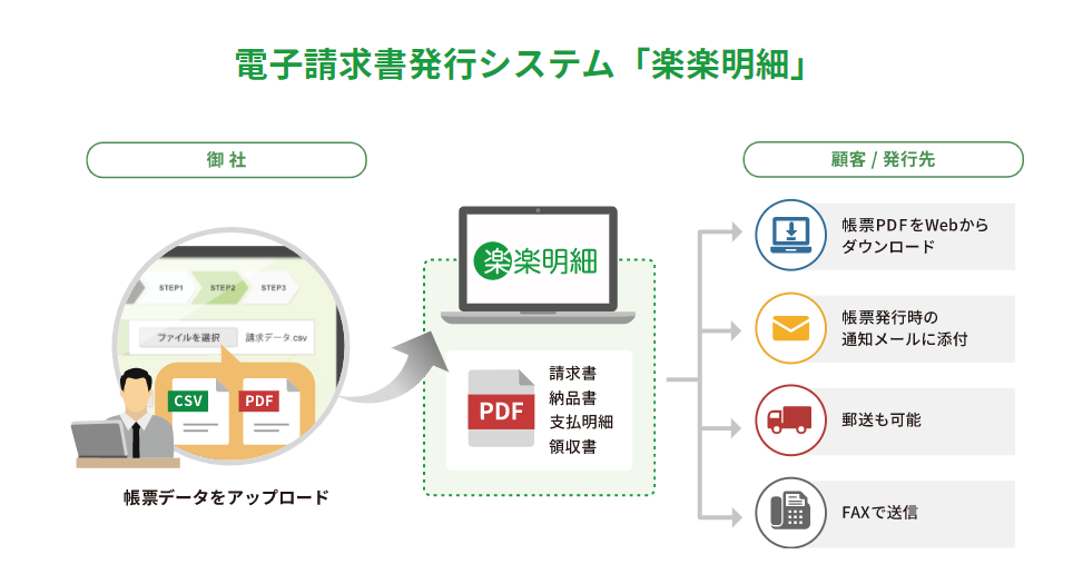 電子請求書発行システム「楽楽明細」は、請求書をはじめ、納品書・支払明細などのあらゆる帳票を電子発行できるクラウドシステムです。発⾏先に応じて「WEB」「メール」「郵送」「FAX」を設定可能。中小~上場企業にまで幅広く選ばれる、契約継続率99%の安心サービスです。