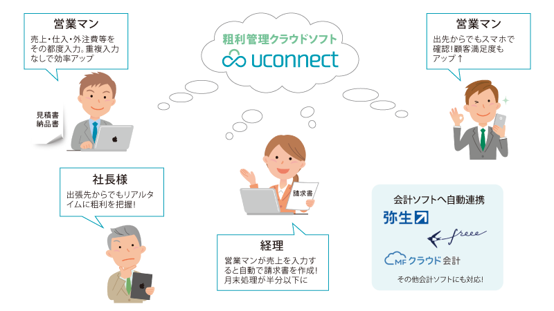 uconnect は、工事台帳を簡単に作成でき、工事に関するの見積書・発注書・発注請書・請求書など、工事業務で使用する各種帳票を出力することができるクラウド型のサービスです!