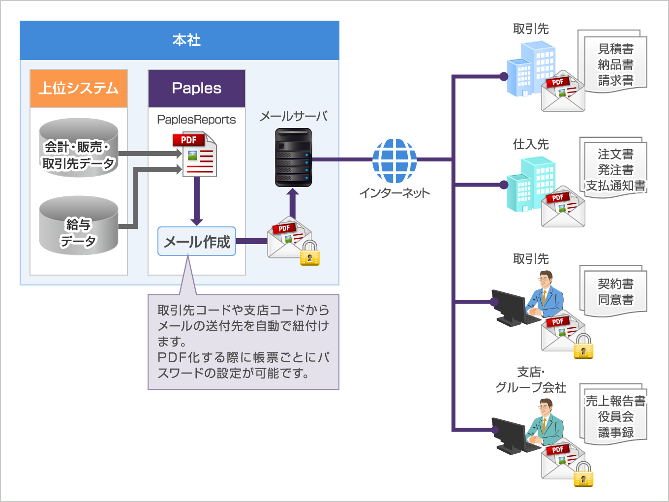 Paples(パピレス)は、上位システムから連携した帳票データからPDF帳票を生成し、データ内のコード(例:取引先コードや支店コードなど)を自動で読み取り、送付先メールアドレスと紐付け、適切な宛先へリアルタイムに帳票をメール添付配信します。