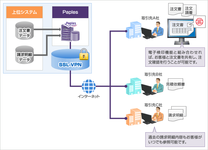 上位システムから連携したデータからPaples内で請求書などのPDF帳票を生成し、帳票内のメールアドレスや取引先コードを自動で読み取り、メールに添付し配信します。インターネットFAXとも連携し、注文書などの自動配信も可能です。また取引先ごとのWebポータルページに注文者や支払通知書などを公開し、電子検印などで電子承認をもらうことも可能です。