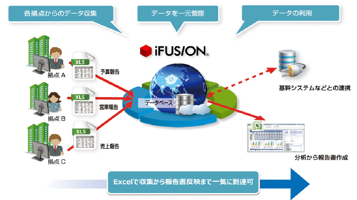 現在Excelは、情報収集や報告業務に欠かせないツールになっています。ただそれだけに、作業に多くの時間やコストを割いてしまっているのが現状です。「iFUSION」は、Excelで管理している予算や見込、業績管理など、データ収集に必要なフォーマットを自由に設計することができます。普段Excel作業をするのと大きく変わらない使用感で利用できる仕様ながら、業務を効率化し、他の業務に専念できる時間を捻出します。