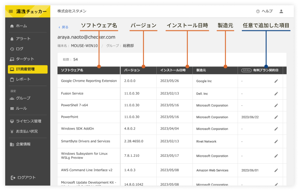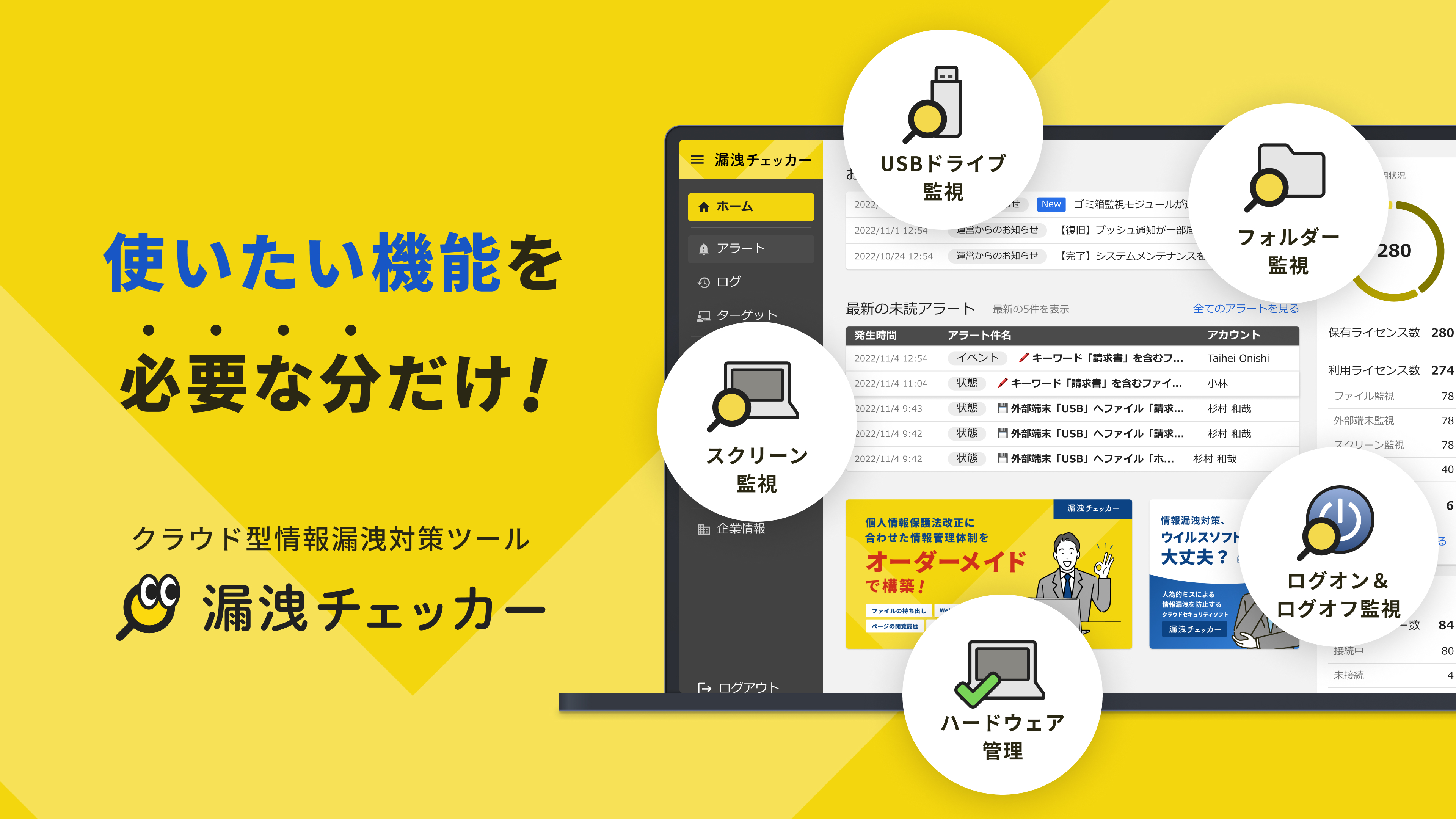 IT資産管理、内部不正対策で、このようなお悩みはございませんか? ・必要最低限の機能でツールを契約したい ・エクセルでIT資産管理をするのが大変 ・セキュリティソフトは入れたけど、内部不正への対策は不十分。 IT資産管理の構築なら漏洩チェッカーにお任せ! 漏洩チェッカーはIT資産管理はもちろん。人的ミスなどの内部からの情報漏洩や労務管理など、様々な情報に関するお悩みを解決します!