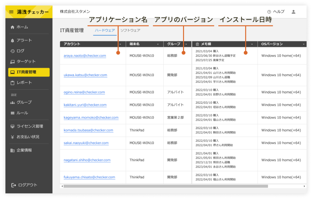 | 機能・仕様 | 機能:ハードウェア管理、ソフトウェア管理、フォルダー監視、スクリーン監視、PCログ勤怠管理 |