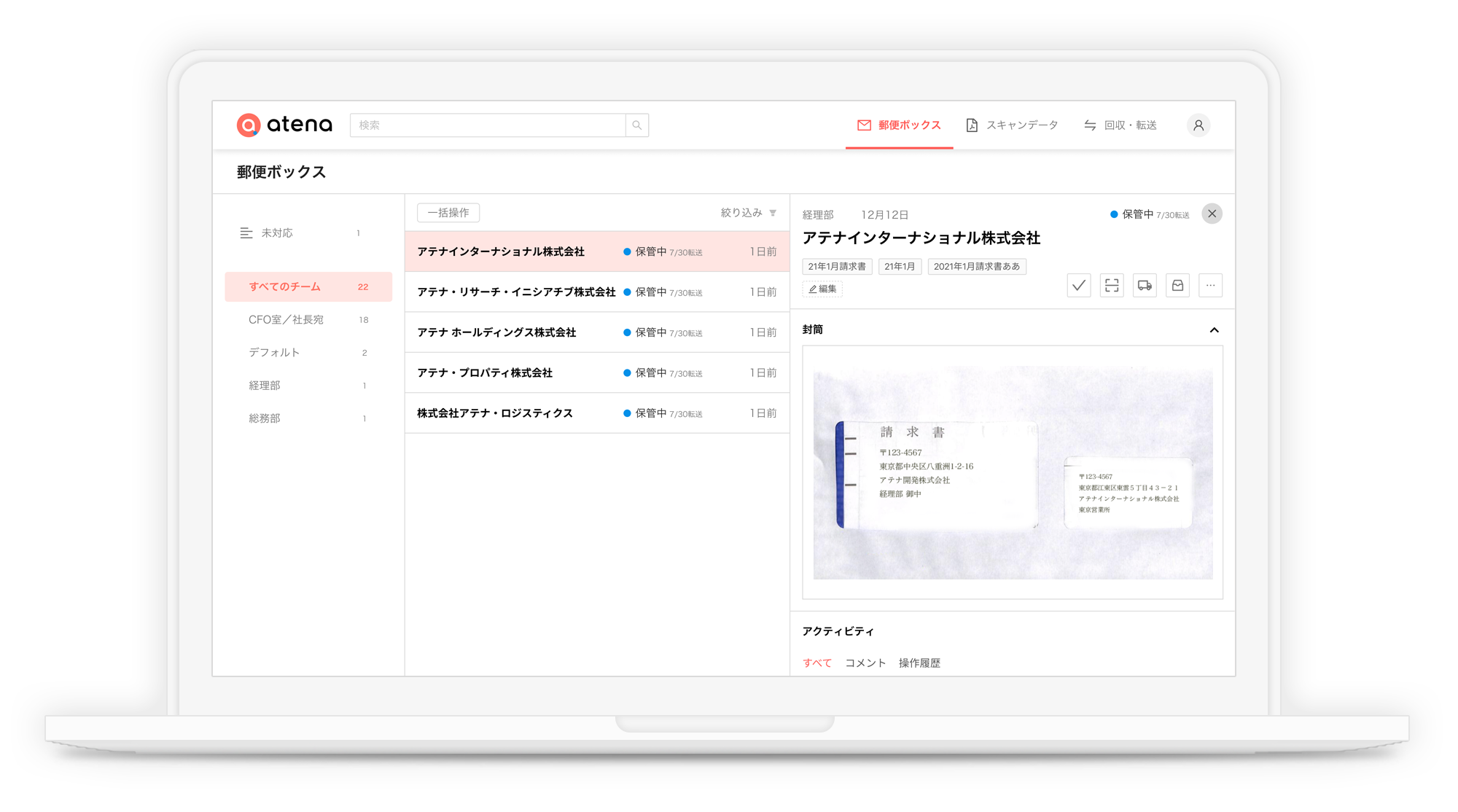 クラウド郵便atenaは会社に届く郵便物をお預かりし外観・内容物を電子化するサービスです。