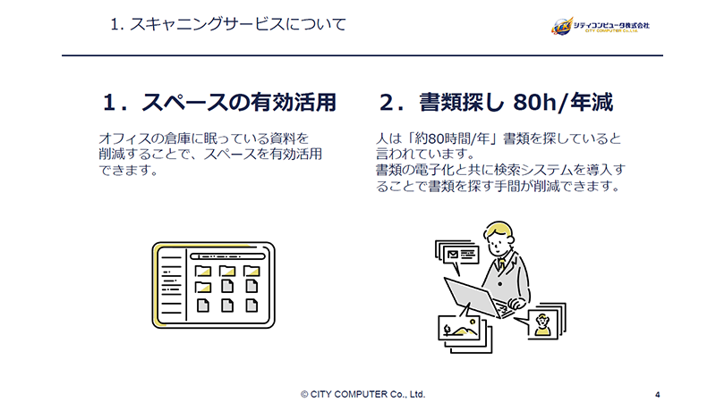 弊社シティコンピュータが提供しているスキャニングサービスのご案内です。 スキャニングサービスを利用して大量の紙文書を電子化することは、業務効率化やコスト削減に繋がります。 DX推進の第一歩として、ぜひスキャニングサービスをご検討ください。