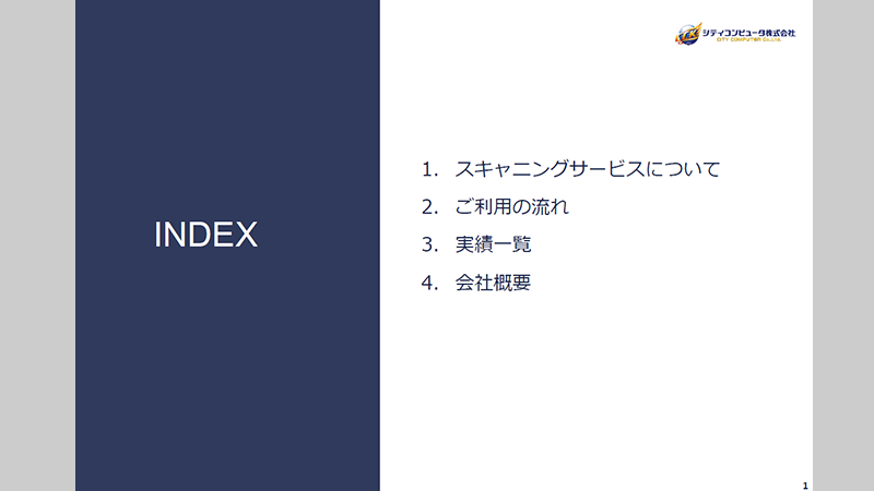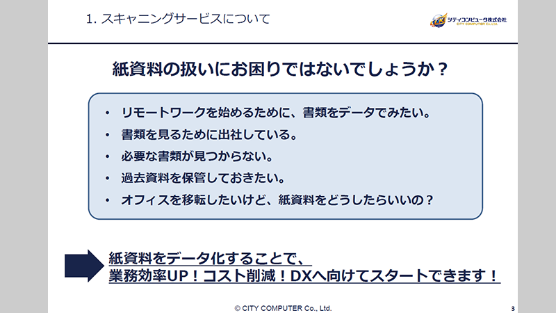 弊社シティコンピュータが提供しているスキャニングサービスのご案内です。 スキャニングサービスを利用して大量の紙文書を電子化することは、業務効率化やコスト削減に繋がります。 DX推進の第一歩として、ぜひスキャニングサービスをご検討ください。