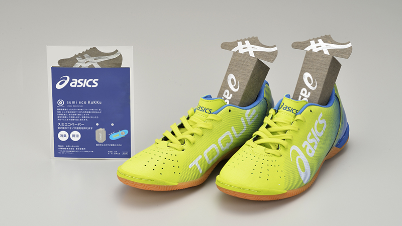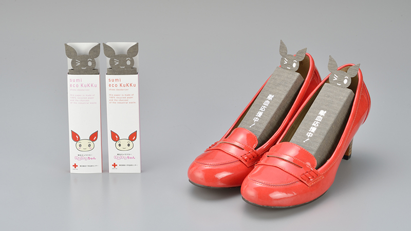 山陽製紙のSumideco Paperは製造副産物の炭と古紙で製造されています。 通常は糊や樹脂(塗布剤)を使って素材(炭)を固定しますが、山陽製紙の抄き込み技術によって 糊や樹脂を使わずに素材(炭)を固定することができます。このため、通常の抄き込みに比べ 素材の残存率が相対的に高くなり(当社比)、高機能な紙を作ることが可能になります。 このSumideco Paperを使用したのが靴用脱臭カードの「eco Kukku(エコクック)」です。 カード本体とパッケージにお好きなデザインを施すことが可能で、 ノベルティやコーポレートギフトとしてもおすすめです。