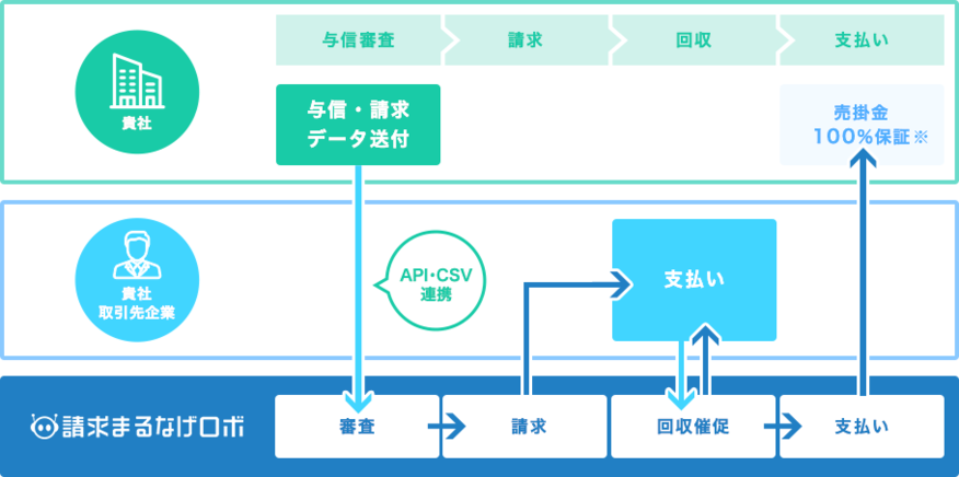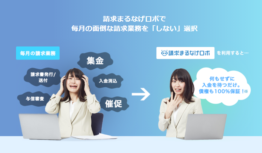 「与信・請求・集金・消し込み・督促」業務をまるなげ。しかも100%債権保証。業務負担や未回収リスクの心配から解放する請求業務アウトソーシングサービスです。